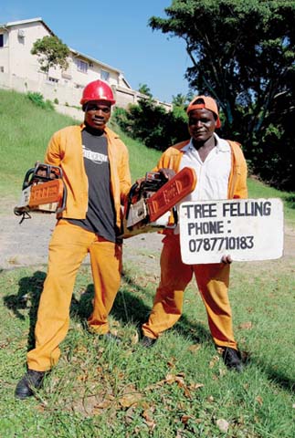 Standing in the blazing sun, day after day, one can find business partners John Mapupa and Mathias Maranga. They wait at the M4 underpass between upper and lower La Lucia, in Armstrong Avenue. Chain saws at the ready, they wait for people to engage their services. They wear bright orange overalls.