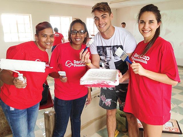 A dreary, blue Monday turned out to be a happy one when RedCap Foundation volunteers (from left to right: Laila Simon, Belinda Adams, Steve Turner and Jessica Swart) took time out of their busy schedules to help out with art classroom upgrades at St. Christopher and Nyakana primary schools in rural KwaDukuza today.