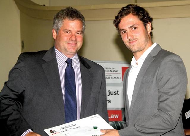 Proud recipient of the 2013 Award, Mr Caleb Joel Tudor Jones, also received the Abel Torf Prize for best overall LLB student, the KwaZulu-Natal Law Society Prize for best LLB student and the Phatshoane Henney Group Honour Medal for graduating summa cum laude.