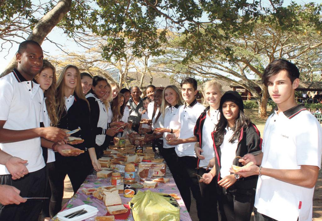 The community-service club members of Crawford College North Coast donate money which is used to buy the basic ingredients for these students to make a large pile of sandwiches, which is then donated to the Kwa.Mama community-centre.