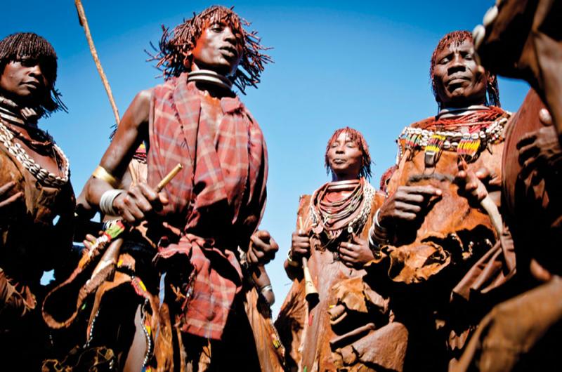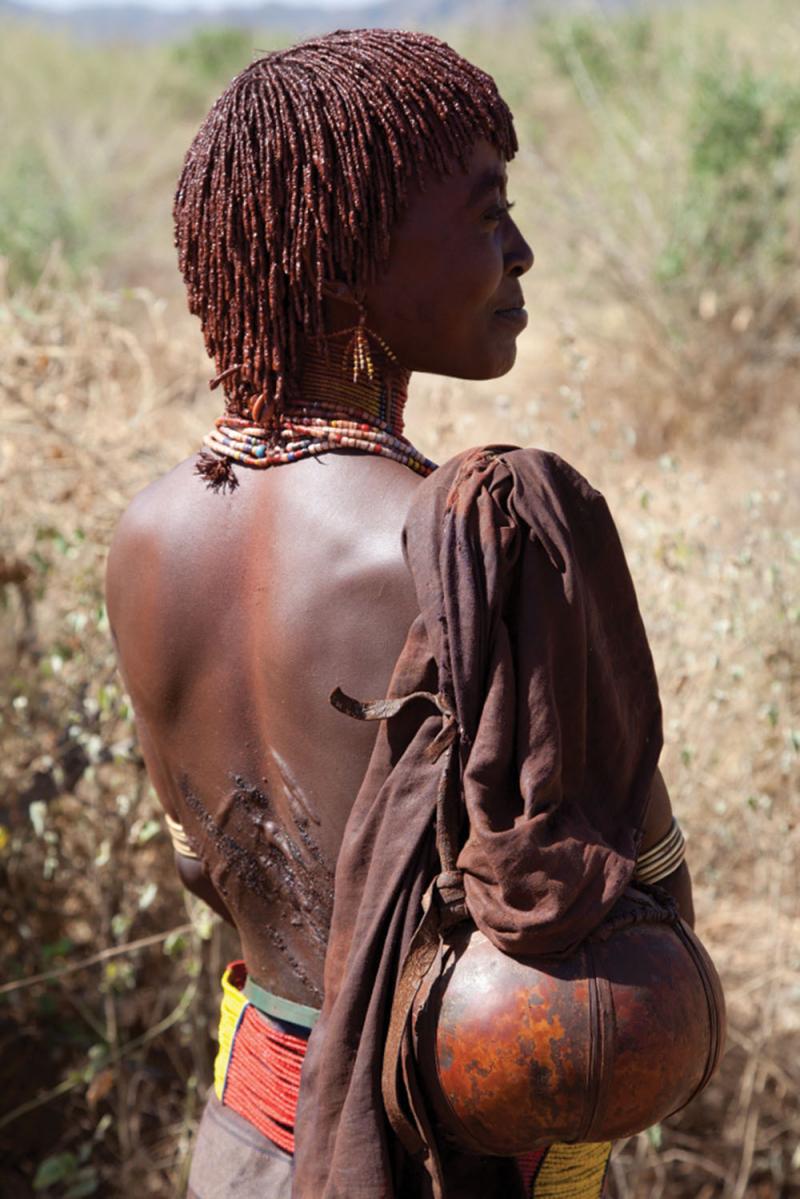 Metal bracelets, armbands and anklets jingle as she dances forward again, her leather skirt decorated with beads and cowrie shells swings from side to side. I wince as he raises the long thin whipping stickcrack! even harder this time, and another deep slash is added to the others. Adi tells me, that as proof of her Hamer tribal culture, she will proudly wear her horrific scars for life.