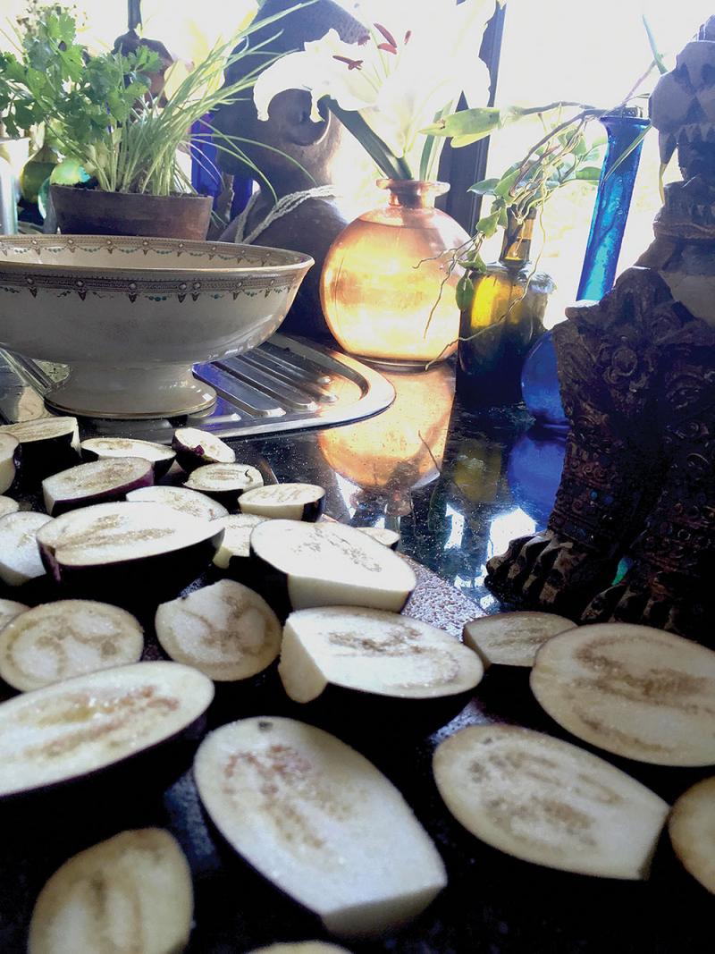 When cutting a brinjal, use a stainless steel knife as carbon steel will react with its phytonutrients and cause it to turn black. Wash the brinjal first and then cut off the ends.