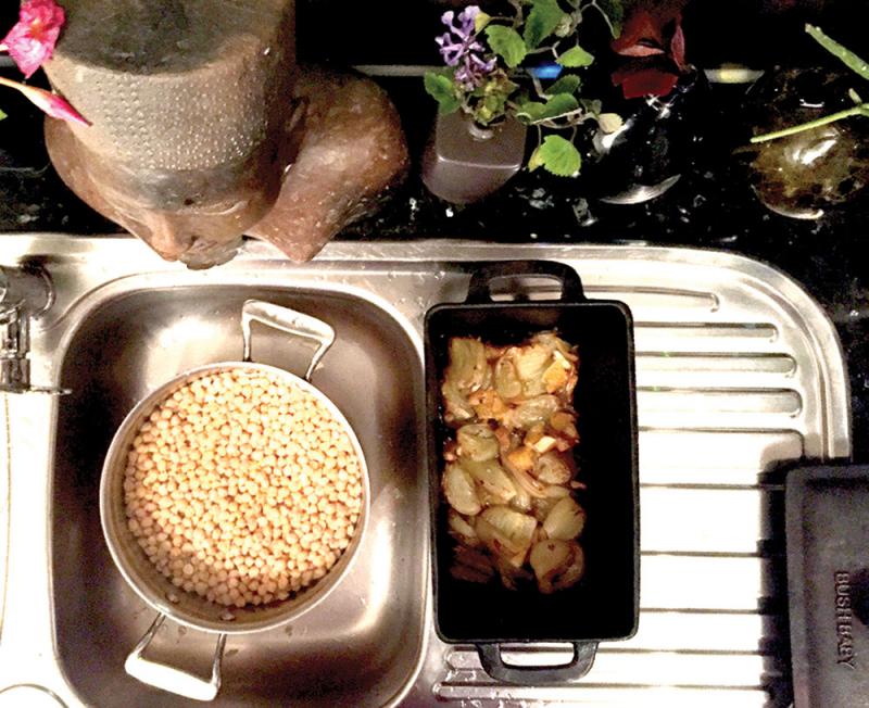 Soak chickpeas overnight. Rinse and cook for 4-5 hours with the onion, garlic and ginger.