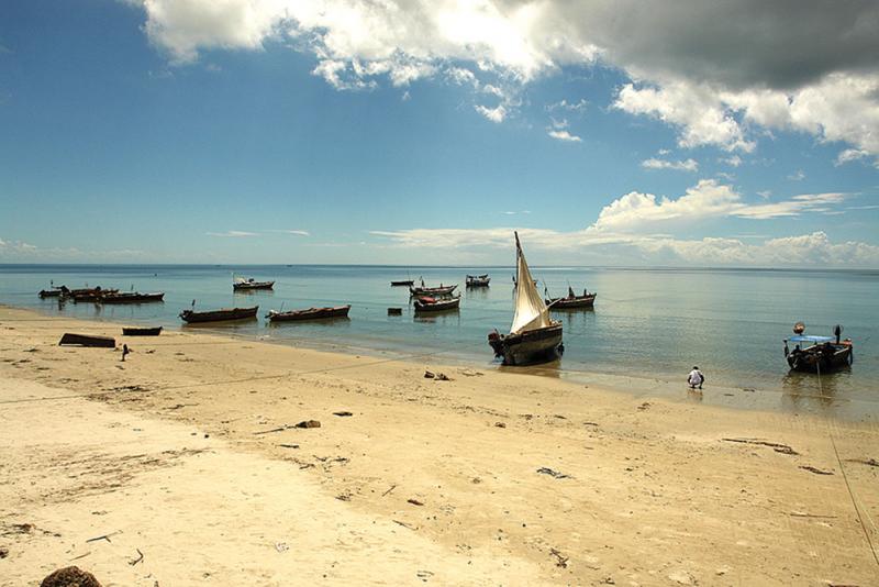 Next day still following the edge the Kusi picks up into an uncomfortable bone-jarring chop, hour after hour, big storm clouds over Pemba Island in the North of Zanzibar, the weather's turning ugly. The warm rain hits us in sheets, the sky goes dark, the visibility is poor but at least the wind drops and the sea smoothes out. We reach Bagamoyo at low tide in the rain and are forced to anchor about a kilometre from the shore. "You better wear strops - sea urchins," says Ross, "I'll stay with the boat." Dripping wet I walk into Helen and Frank's bar at the Traveller's Lodge.