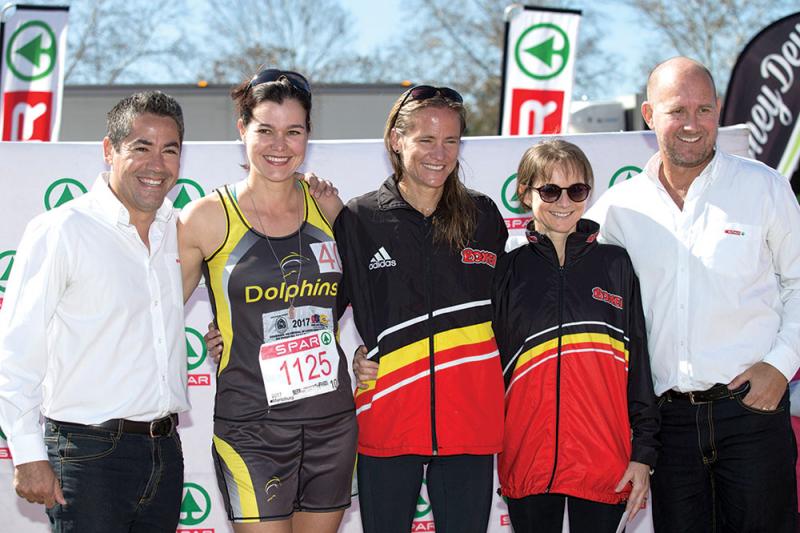 Pictured at the prize giving for the Maritzburg SPAR Women's Challenge on Sunday are Delia Jay, Tanith Maxwell and Janene Carey who were the top three ladies in the 10km in the category of 40 - 49. Jay runs for the Dolphin Coast Striders and completed the race in an impressive time of 44.40, just under 7 minutes behind the Olympian and SA Marathon runner, Tanith Maxwell. They are pictured with MD of SPAR ZN Max Oliva and Peter Deeb, Marketing Director for SPAR KZN. Pic by Rogan Ward.