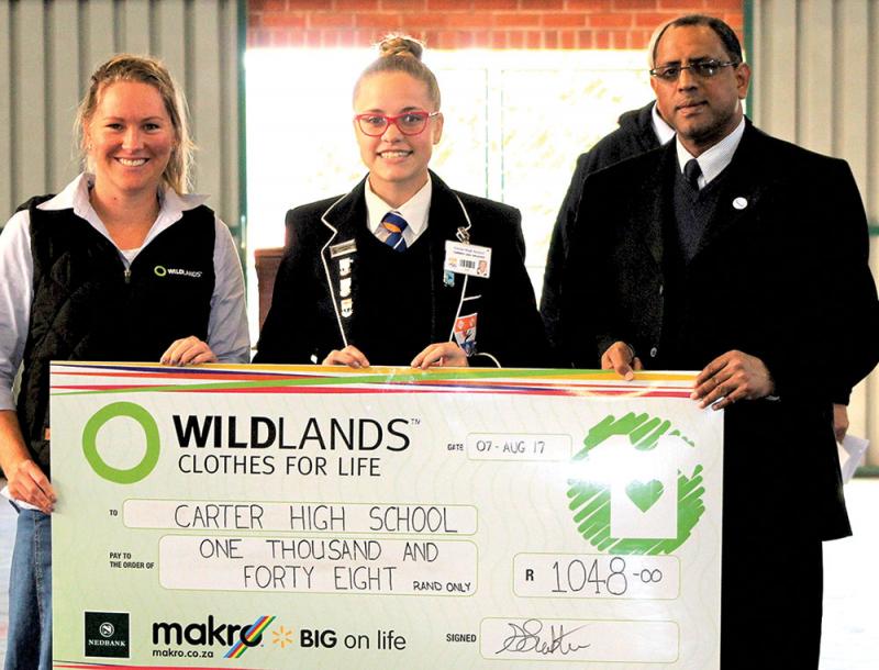 Carter high school has supported the Wildlands' Clothes for life project since its inception in 2015 and has donated over 530kgs of clothes to the programme this year. Amy Webster of Wildlands recently handed over a ceremonial cheque to the school in recognition of their donations made possible by Makro and Nedbank. Carter High school raised R 1 048 for their school and contributed to a network of "clothes-preneurs" from under-resourced communities who sell the clothes on to make a profit.