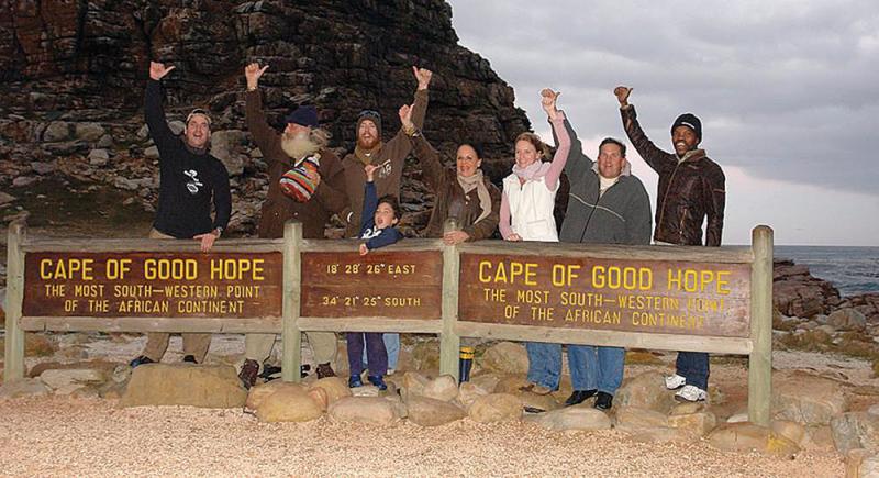 And it ends in just a few seconds as we all place our hands on the calabash of much travelled seawater taken from this point 448 days ago. We remove the stopper, shiver with cold as it glugs slowly back into the cold South Atlantic. We hug, kiss and shake hands and line up behind the Cape of Good Hope sign. We raise our mugs in a salute to Mama Africa - WE'VE MADE IT
