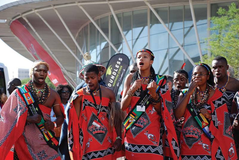 There's a frenzy of activity outside the Tourism Indaba in Durban. Ministers of Environment and Tourism and conservation officials applaud, traditional dancers from all over southern Africa sing a 'Boundless' song and a masked mkishi dancer from Barotseland walks tall on high stilts. "Hambani