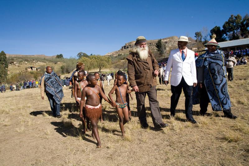 "Nobody is flying today," comes the message from the military base in Maseru. It's so bloody cold; they can't even start the helicopter's engines. Huddled around the Landies in gloves, beanies, scarves and thermal undies, we discuss logistics. There's an entire community waiting for us near the Katse Dam and we can't let them down. We decide to make the twelve-hour, turn-around dash in the two faster Land Rover Discoveries, and meet the rest of the team at the historic Liphofung Caves. Twists and turns, iced roads and frozen, stalactite waterfalls bring us to the almost 60-kilometre-long Katse Dam. Colourful horsemen and 'cow whisperers' with their cattle draped in bells and plastic bags, lead us into one of the most exciting community days yet.