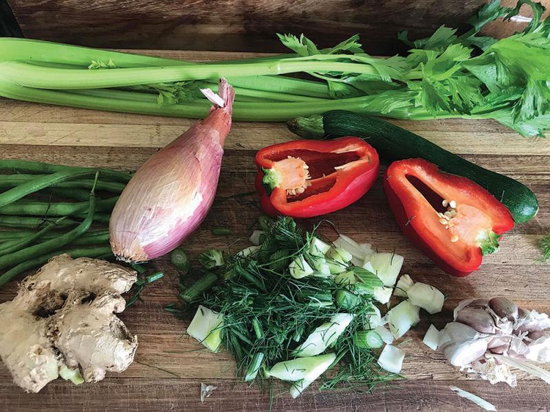 Add the beans, celery, cauliflower and red pepper and fry until crunchy (about 15min)