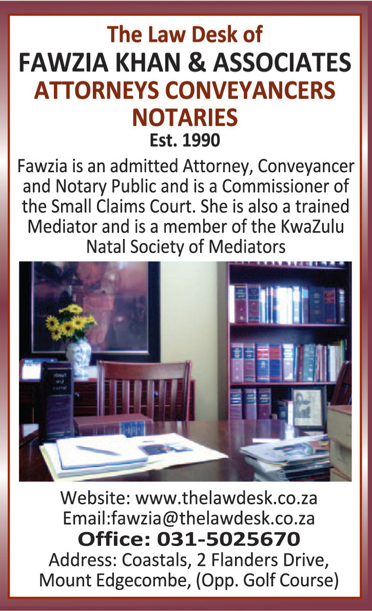 Know your rights! The Law Desk of Fawzia Khan and Associates. Giving YOU the Power of Attorney. Email fawzia@thelawdesk.co.za or call 031-5025670 for legal assistance at competitive rates.