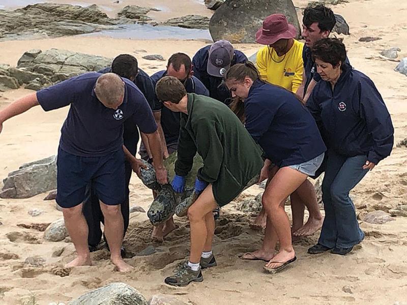 The KZN Marine Stranding Network was activated last Sunday morning to a large Green turtle being bashed around upside down on the rocks at Lucien Beach in Margate. The lifeguards from Ray Nkonyeni Municipality rescued her and placed her on the beach.