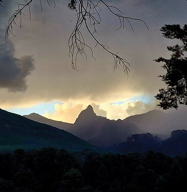 Drakensberg dawns. Curtains drawn. A glow sneaks through the mountains and scatters into glitter. Touching and fleeing the windowpanes. I leave the house to snore peacefully on. I swan around the lake. My feet are dew-soaked within seconds. I marvel at droplets slipping and sliding on leaves but refusing to fall. How much more we listen when the traffic of life is stalled. My pig tails are like antennae, shooting upwards as my eyes cast down. In the grass. Beckoning. A lacy wonder of gossamer light.