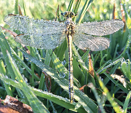 A frozen dragonfly! Nervousthat I would disturb its' slumber, I lay down in the grass. Edging close enough to see its skeleton, outstretched wings a silvery network of lines. A living, shimmering fossil. Waiting for the sun to warm its body and liberate it into flight.